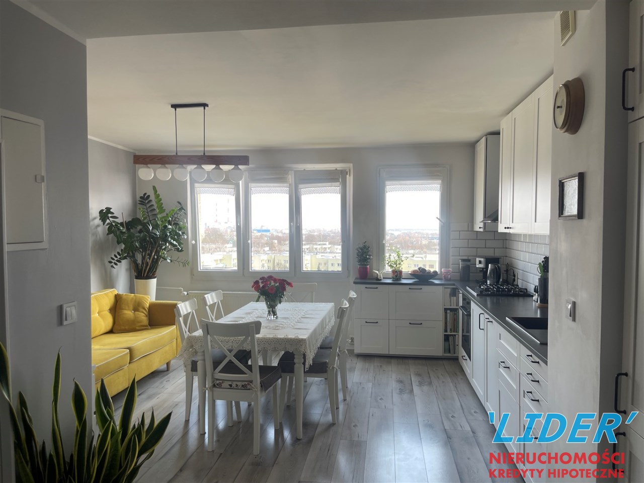jasnego salonu z aneksem kuchennym,